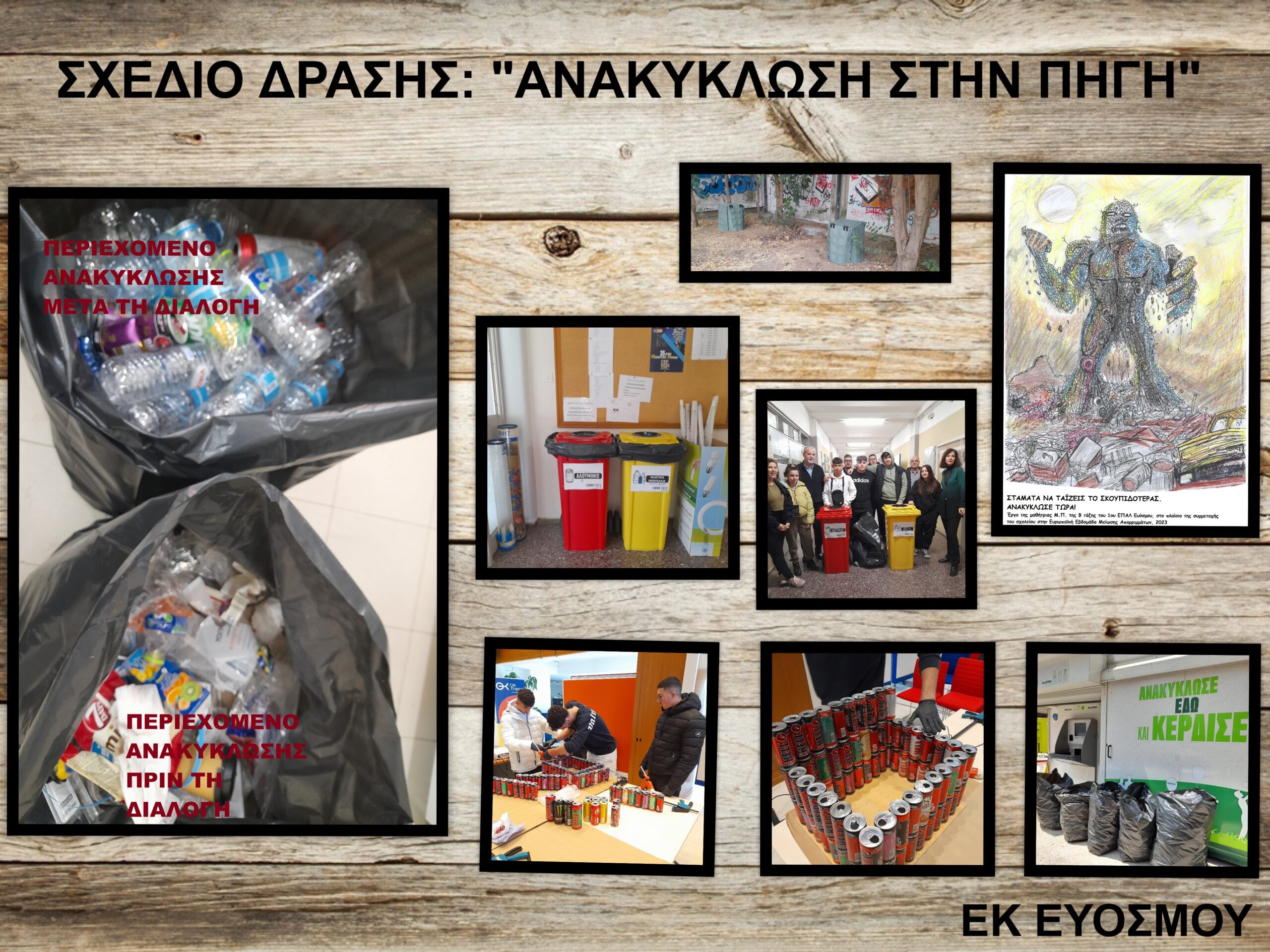 Στο πλαίσιο της ορθολογικής διαχείρισης των απορριμμάτων των εργαστηριακών ασκήσεων, το ΕΚ Ευόσμου προμηθεύτηκε και τοποθέτησε κάδους για την ανακύκλωση χαρτιού, μετάλλων, συσκευών και μπαταριών. Ωστόσο, το μεγαλύτερο πρόβλημα παραμένει ο όγκος των συσκευασιών τροφίμων που απορρίπτονται από τη σχολική κοινότητα. Σε δράση που υλοποιήθηκε το σχολικό έτος 2023-2024 σε συνεργασία με το 1ο ΕΠΑΛ Ευόσμου, τοποθετήθηκαν στο σχολείο κάδοι για την ανακύκλωση πλαστικών και αλουμινένιων συσκευασιών τροφίμων.