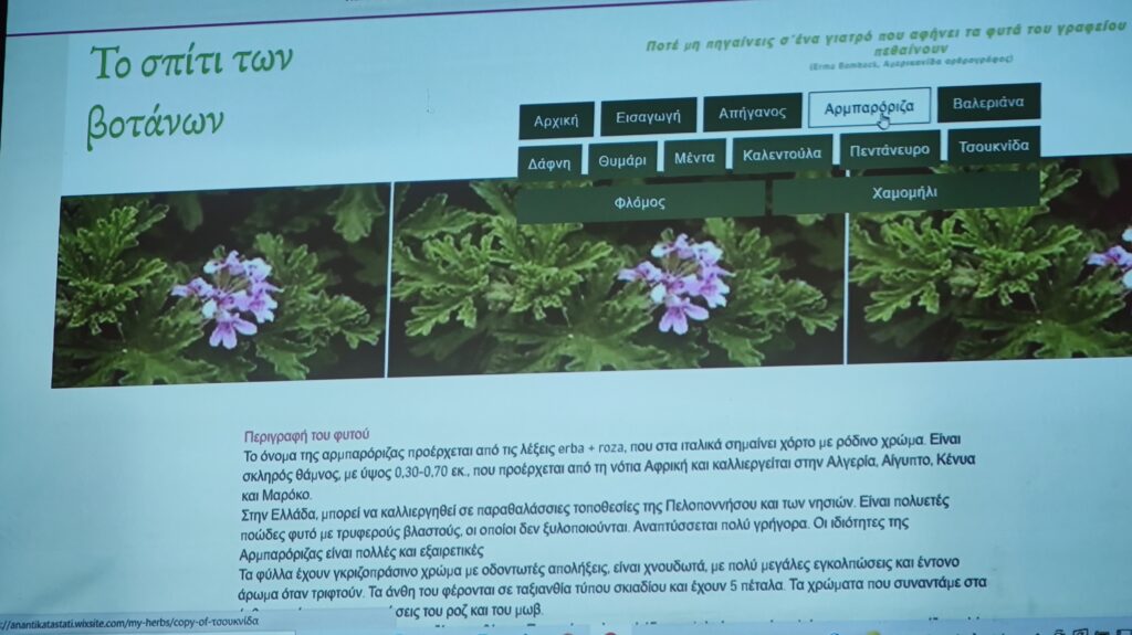 Από το τμήμα της Νοσηλευτικής παρουσιάστηκε η ιστοσελίδα που κατασκεύασαν οι μαθητές με τίτλο «Το σπίτι των βοτάνων» με πληροφορίες γύρω από τη χρήση των βοτάνων, αντενδείξεις, αλλά και μύθους ή ιστορικά στοιχεία, υπό την επίβλεψη της καθηγήτριας κ. Μπουραζάνη Χρυσάνθης. Από το τμήμα της Φυσιοθεραπείας με τη μορφή προγράμματος παρουσίασης διεξάχθηκε εισήγηση με θέμα «Τα βότανα κι η χρήση τους στη φυσιοθεραπεία», με αναφορά στα αιθέρια έλαια των βοτάνων που χρησιμοποιούνται στη θεραπευτική μάλαξη και σε άλλες παθολογικές καταστάσεις, τις παρενέργειες, τους κινδύνους και τη σωστή χρήση τους υπό την επίβλεψη του καθηγητή κ. Μαυράκη Χαράλαμπου. Από το τμήμα της Αισθητικής προβλήθηκε βίντεο στο οποίο παρουσιάσθηκε η δράση του τμήματος που αφορούσε την παρασκευή κηραλοιφών με την χρήση βοτανόλαδων που παρασκεύασαν οι ίδιες οι μαθήτριες. Οι συγκεκριμένες κηραλοιφές προσφέρθηκαν στην Εστία Παπαγεωργίου και στο Γηροκομείο που βρίσκονται στον χώρο της εκκλησίας του Αγ. Αθανασίου στον Εύοσμο Θεσσαλονίκης, υπό την επίβλεψη των καθηγητριών κ. Πιπερίδου Αργυρής και κ. Ιορδαμλή Πασχαλίας.